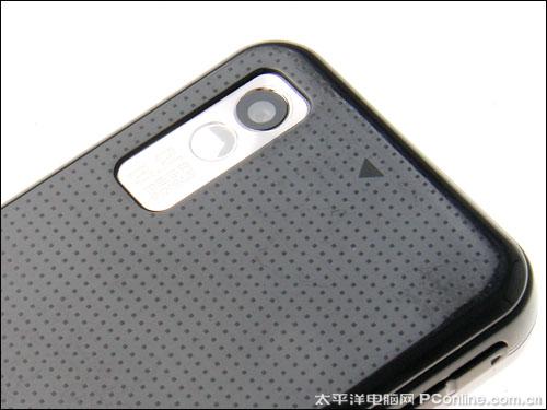 背面的设计也是相当简洁的,主要以黑色为主调,上面印了许多小正方形的突起颗粒,既美观同时手感更好。由于定位于中低端市场,所以仅配置了320万像素的摄像头,硬件配置不高,不过银色的摄像头区域在背面显得十分醒目。