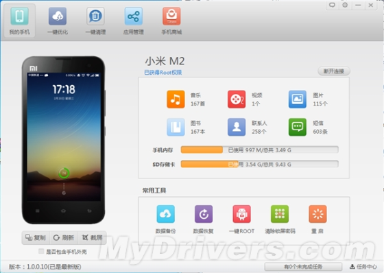 刷机大师同样集成有不少手机工具,最上面的手机管理将调用刷机大师手机助手,刷机大师手机助手具有一键优化、一键清理、应用管理功能,常用的工具也都有集成。