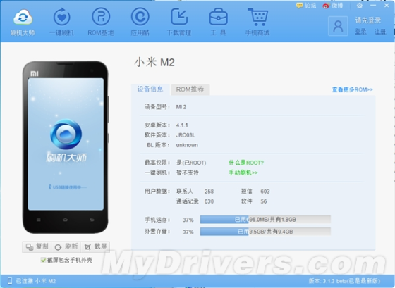 笔者在连接小米2之后,主页面会显示当前手机屏幕内容,设备信息,手机存储和ROM推荐,刷机大师还显示了当前手机是否已经ROOT,是否支持一键刷机,如果不支持一键刷机,一键刷机功能是无法使用的。