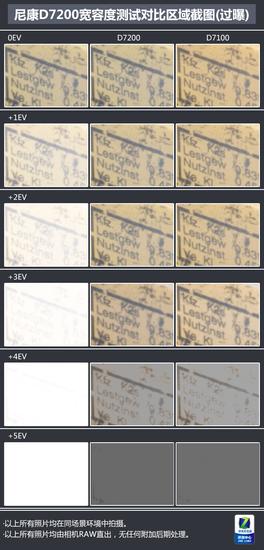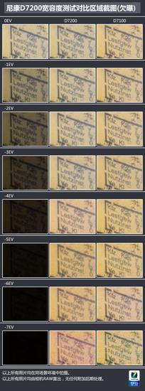 我们分别进行了欠曝和过曝下的宽容度测试,从测试中我们可以看到这块D7200的传感器的画质性能有多么强悍。我们在欠曝7EV的情况下,相机在几乎全黑的部分仍然了保留了相当多的细节。而在-1到-4EV,拉回正常曝光的照片颗粒感都非常轻。-6EV和-7EV仍然可以做后期处理来找回照片细节,只是相对的颗粒感会有明显提升,同时照片会出现一定的偏色(同白平衡下)。而相较于上一代旗舰D7100,D7200的优势在于其欠曝拉回的颗粒感要明显低于D7100,而且在极限的-7EV条件下,D7100已经由于采用和算法的问题出现条纹状成像的问题,而D7200则完全没有,可见新机的宽容度表现要更好。