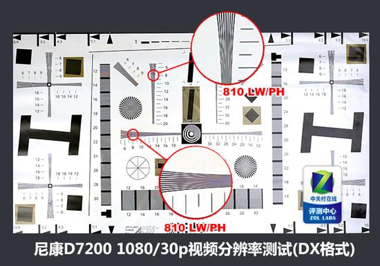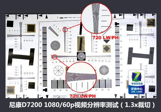 从测试结果来看,采用DX格式(1x)拍摄的1080/30p视频分辨率表现,要优于采用1.3x裁切下的1080/60p视频分辨率。可以看到,DX格式下尼康D7200的视频分辨率可以达到810LP/MM左右,而1.3x裁切时,其1080p视频只能达到约720LP/MM。因此如果你追求视频清晰度,我们建议在D7200上采用DX格式的1080/30p视频来进行拍摄。就视频性能而言,尼康D7200的视频表现基本和同级别的单反相机处于同一水平上,这仍然是一台以拍照性能为主要研发方向的相机。