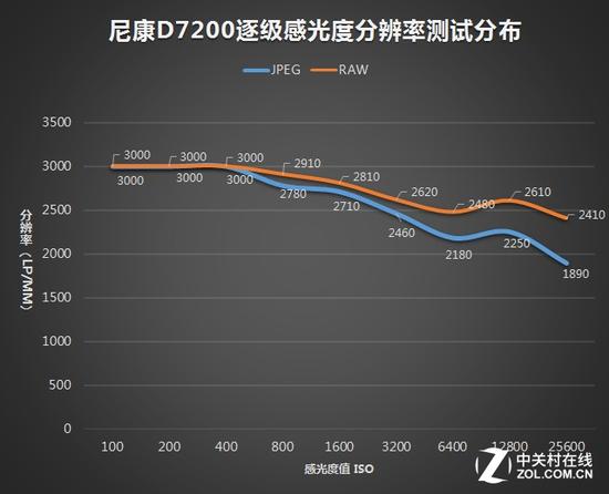 而随着感光度的提升,我们可以渐渐看到相机的分辨率开始出现下降(从ISO 800开始),测试时我们分别采用了RAW格式和JPEG格式,结果不出所料RAW下相机的分辨率保持要更好一些,相近在ISO 6400时仍能保持2400线以上,而JPEG下相机的分辨率下降就比较明显了,如果以2400LP/MM为标准,相机的RAW格式都可以很好的满足分辨率要求,而JPEG格式下从ISO 6400开始就很难满足这个要求了。因此使用D7200时笔者建议大家更多使用RAW拍摄,这样相机的高画质才能得到更好的体现。