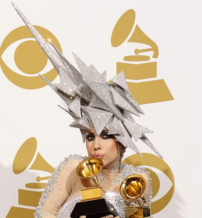 在现场表演环节,“舞后”Lady Gaga身着“变色龙装”,与埃尔顿·约翰对弹钢琴的演出早早将全场气氛调动得异常热烈。她也不负“雷帝”称号,在走红毯时和演出过程中先后换上多套夸张“雷”服,让观众一饱眼福。她的首张专辑《Fame》也不负众望获得了最佳舞曲/电子乐专辑奖,专辑主打歌《Poker Face》获得了最佳舞曲单曲奖。