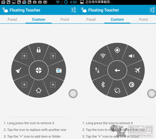 这款APP名叫《Floating Toucher》使用起来非常简单,安装好以后直接启动就会进入设置界面。默认功能有Home键、锁屏、清理内存和快捷设置四个,点击加号或者功能图标可以直接添加、编辑快捷操作,最多可以添加8种。