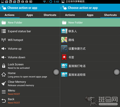 《Floating Toucher》可以添加的功能包括动作、APP、快捷方式三种,动作主要包括的是手机操作,除了传统的WIFI开关等以为,还可以直接代替手机按键进行返回、菜单、音量调节等操作。APP包含了手机内的全部APP。快捷方式则可以记录直接拨电话去某人、或者记录某个常去地方的地址,直接导航。