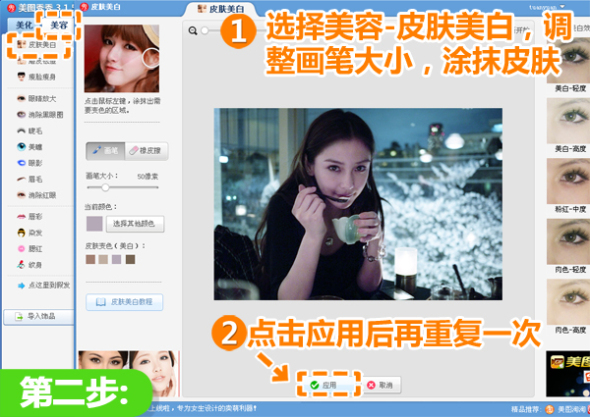 2、进入“美容”菜单,选择“皮肤美白”,调整画笔大小,涂抹皮肤,局部提升皮肤亮度后点击“应用”。