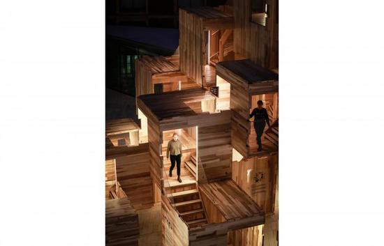 设计师想要回应两大问题——对住房的需求和气候变化;试图提出这样一种融合了可持续建筑材料和模块系统的解决方案。这个“迷宫”所用的材料是可重复利用的美国的郁金香木(tulipwood)。