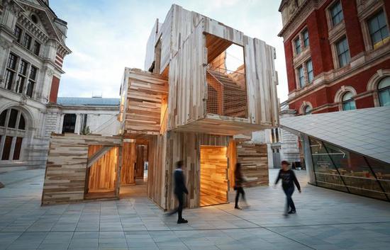 这是一件像迷宫一样的由“积木”搭建而成的互动性装置,摆放在维多利亚及阿尔伯特博物馆(V&A)的赛克勒庭院,由伦敦当地建筑事务所 Waugh Thistleton Architects 以及建筑环境咨询公司 Arup 和美国硬木出口委员会(AHEC)共同完成。