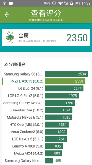 Vellamo评测,单核满载测试金属得分2350分,落后于搭载Galaxy S6的Exynos 7420,领先于LG G4的骁龙808。而多核成绩得分为2175,排名同样位于主流旗舰手机前列。