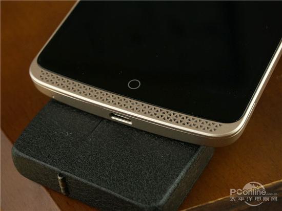 从细节图可以看到机身背面上下方位置均覆盖着仿皮革装饰,虽然材质为塑料,但相对于一般采用皮纹后盖的机型来讲,中兴AXON天机上面的材质给人手感更细腻,有着一种微妙的柔软效果。