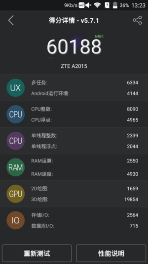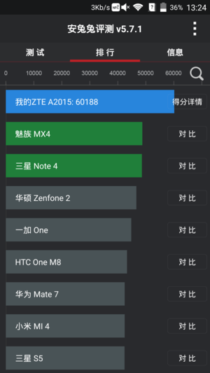 安兔兔得分突破6万,领先于很多旗舰手机,中兴AXON天机性能非常卓越。