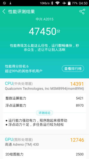 从客观数据我们可以知道中兴AXON天机能流畅运行各种大型3D游戏,一般日常使用更是不在话下。