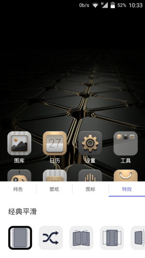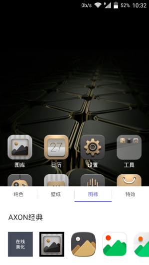 进入主屏界面,中兴AXON也同样采用了直接把图标放在桌面上的做法。我们可以看到,AXON的默认图标都经过了重新绘制,基本采用了黑金配色。当然,你也可以从底部上滑呼出设置界面,将按钮样式改为其他。同样可修改的,还有页面滚动的动效。