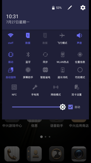 中兴AXON的下拉菜单采用了两段式设计,第一次下拉只会出现五个最常用的快捷键选项,以便于你选择。当第二次下拉时,就会出现剩下的所有快捷方式,并且可以修改当前亮度了。