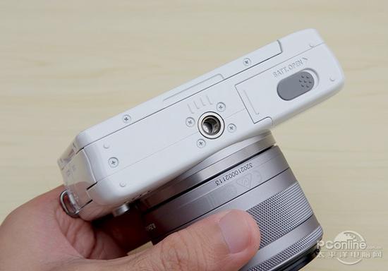 机身的底部中央是标准1/4英寸螺纹,用于接入三脚架。旁边是电池盖,附有防滑橡胶即可帮助轻松打开。