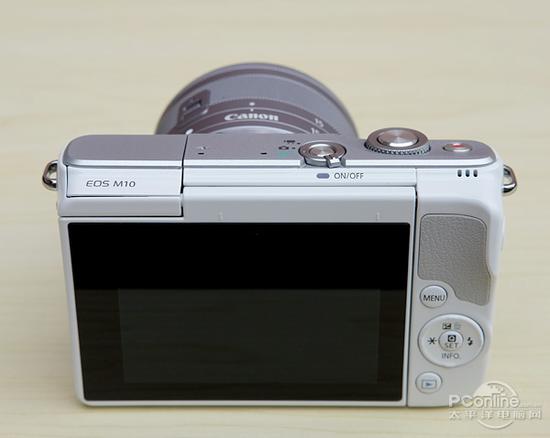 佳能微单EOS M10 背面是一块三英寸的104万画点的液晶监视器,TFT屏幕显示画质色彩鲜艳而细腻。可翻转180°以及可以像手机一样触摸的屏幕使得M10的操作更加智能化。而在液晶屏的右方则是有右手防滑橡胶以及基础的菜单、方向设置键、回放键。