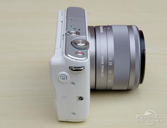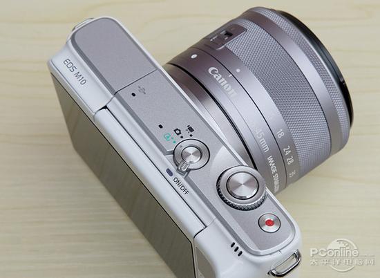 佳能微单EOS M10 的机身顶部非常简洁,左边印有型号EOS M10,一条细缝区分手动弹出式闪光灯和右侧的操作按钮。电源开关键与拍摄模式选择拨盘,还有快门按钮和功能选择转盘都巧妙地“融合”了,才会令相机整体 简单明朗,操作更不会复杂繁琐。为方便使用M10拍摄视频短片的用户,还专门独立出来一个视频拍摄按钮,布局设计可谓非常贴心。