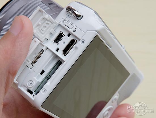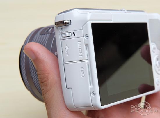 再来看机身的右侧,上方揭盖上印有USB连接LOGO以及HDMI字样,下方则是CARD插入位置。可见EOS M10同样是支持HDMI mini或通过USB接口在各种大屏幕设备上回放拍摄的照片。至于CARD就不用多说了,插入常规型SD卡(SD存储卡、SDHC存储卡、SDXC存储 卡)即可进行拍摄记录。