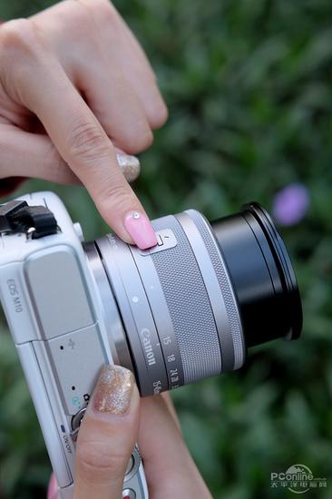 在使用佳能微单EOS M10之前,消费者必先要养成开机之前要开锁的习惯。笔者坦言,美女妹纸在一开始试玩的时候也是不知道镜头要开锁的(囧)。在笔者的手把手教导之下,美女妹纸学会了自拍前要先开锁这一个步骤。嗯,解锁了新的姿势。