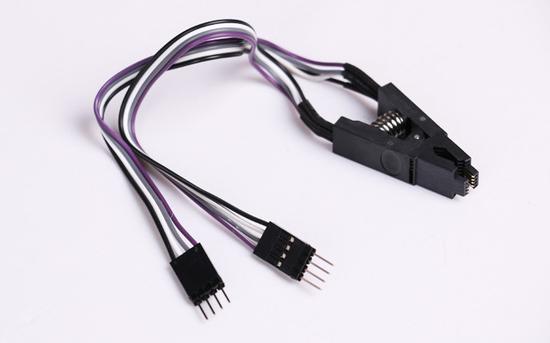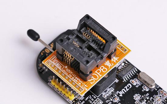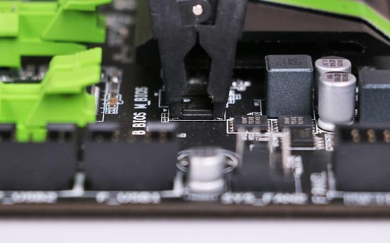 对于技嘉主板一般采用了双BIOS设计,而且为SOP-8贴片封装,这个时候就需要用到SOP-8芯片烧录夹夹住M BIOS芯片,然后用线缆连接至烧录器烧录。