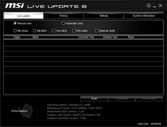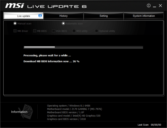 微 星主板BIOS操作系统更新用到的工具名称为MSI Live Update 6,MSI Live Update 6功能比较丰富,除了主板BIOS的 更新,它还提供了主板驱动、显卡BIOS、应用程序、可选应用程序的检测更新。主板BIOS更新过程比较简单,从微星官网 (http://cn.msi.com/)下载MSI Live Update 6应用程序和BIOS文件,然后安装应用程序。