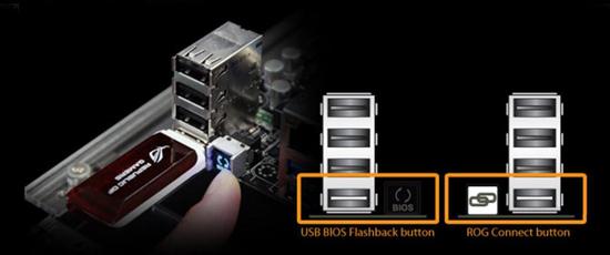 华 硕USB BIOS Flashback主要用于更新已经损坏的BIOS,或者需要回滚到之前版本的BIOS。华硕USB BIOS Flashback 不需要进入BIOS就可以更新BIOS,也就是说主板不插上CPU、内存也可以更新BIOS,操作时只需要将电源24pin连接到主板上,不用按开机键, 然后将U盘插入到USB BIOS Flashback专属接口,再按住ROG Connect按钮并且当指示灯闪烁或者灯亮时放开按钮,BIOS即刷新 成功。