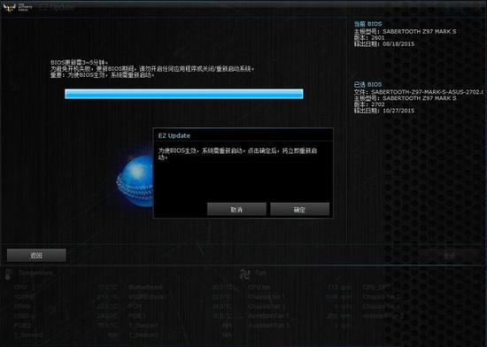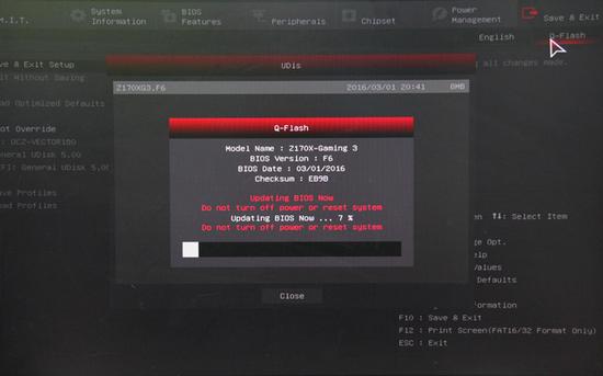 点击运行会出现刷新BIOS重启的对话框,选择确认,系统将重启,重启后就进入到BIOS刷新页面,刷新完成后系统将再次重新启动。这和Intel原厂主板BIOS刷新流程基本一样。