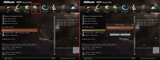 使 用BIOS环境更新BIOS,首先需要将下载的BIOS文件放置到一个FAT32格式的U盘当中,启动电脑的过程中按DEL键进入BIOS界面,然后进入 到Tool页面,选择Instant Flash运行,从弹出的对话框选中U盘中的BIOS文件,回车执行即可刷新BIOS。
