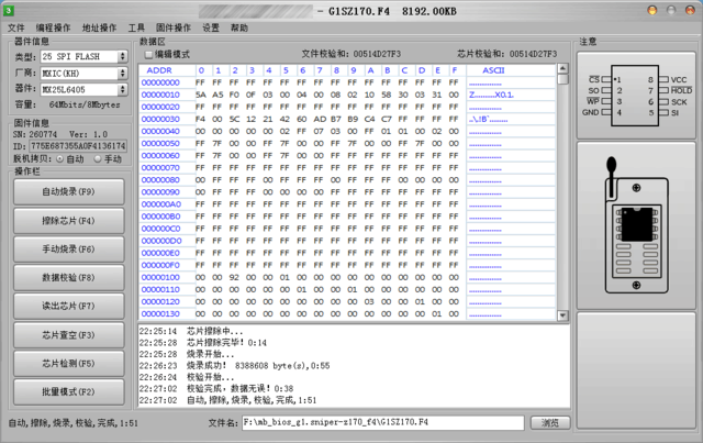 烧录器BIOS的写入过程相对来说比较简单,将芯片链接到烧录器后检测芯片成功连接后,再将BIOS文件加载到烧录器应用程序,直接点击烧录即可。
