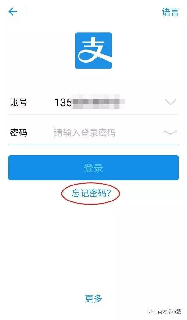 南都君今早10时许进行了测试。在征得朋友(测试时不在同一网络环境中)同意的情况下,南都君尝试用朋友手机登陆支付宝APP,第一步选择“忘记密码”。