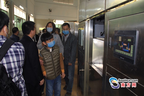 随后,参观队伍来到寄存骨灰的思亲楼。这里可以安放2万多个骨灰盒,目前已经存放有1万多个,全部采用信息化管理。参观队伍还分别参观了火化车间、树葬区、遗体告别厅、祭祀场等。