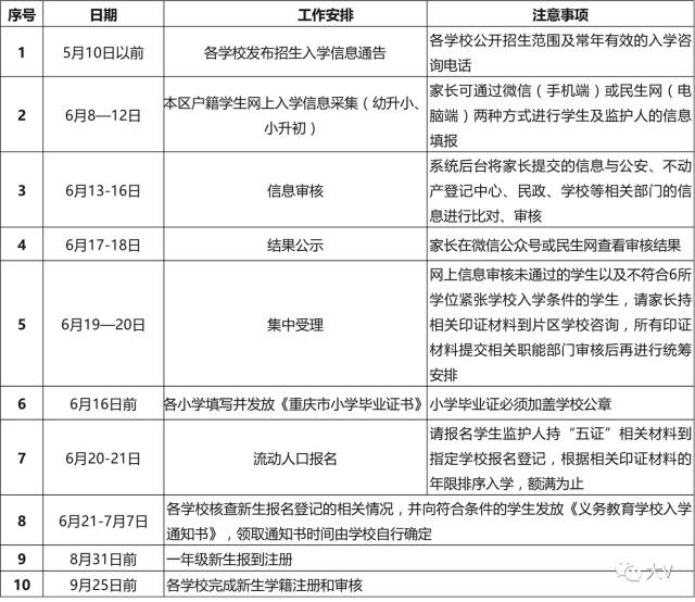 重庆市大渡口区2017年义务教育阶段学校 招生工作日程安排表