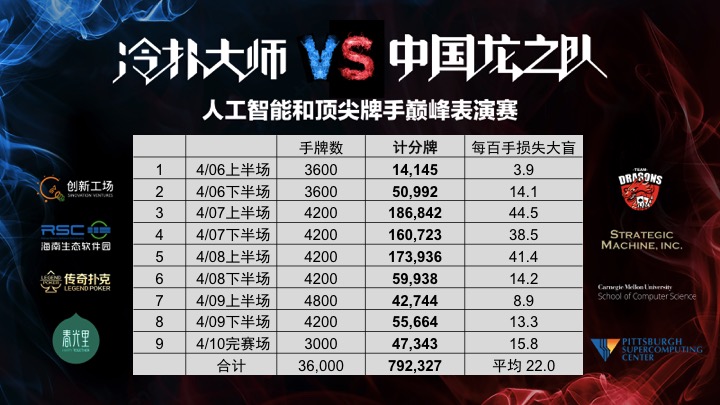 经过5天的鏖战,德州扑克人工智能系统Libratus毫无悬念获得最终胜利。在这场德州扑克人机大战中,中国龙之队的六位牌手共与冷扑大师打了36000手牌,共输792327分,AI完胜人类。
