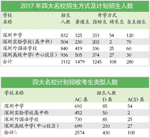 如果是纯粹靠中考成绩的普通生,四大名校的计划招生的AC类考生为1221名,D类考生为258名,对应的录取率分别是1.8%和0.4%。根据深圳市教育局的政策,指标生的计划招生指标未录满,将转为普通生。往年,各校普通生的分数更高,学校为了获得优质生源,一般会放弃部分指标生名额,普通生的实际录取人数会更多一些,对应的录取率也会更高,但比此前想当然的录取率要低得多。