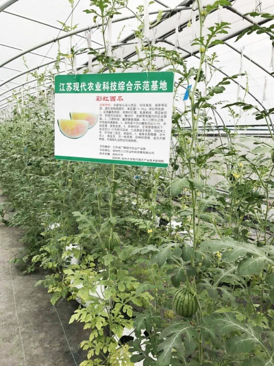 记者看到,这里的蔬菜新品种“颜值”很高,极具观赏性,将整个展示中心“打扮”成了五颜六色的世界。如紫番茄,这种番茄的“父母”来自欧洲,经过扬州大学进一步选育,颜色更加透亮,该番茄可以无限生长,只要管护得好,可以生长几年;黄灯笼椒,这种辣椒没有成熟时呈绿色或绿白色,成熟后呈黄色或金黄色;紫椒成熟后是紫色,白色椒成熟后是白色;彩虹西瓜,瓜肉瓤色特别,成熟时红橙、乳黄相间,西瓜纵切时,剖面如彩虹,横切时,剖面带有隐约的花朵图案,西瓜口感特别,瓤质酥脆细腻,还有独特的清香味,是一种适宜作礼品瓜的西瓜;赛哈密甜瓜,含糖量非常高,可以达到19%,而扬州地区栽植的8424西瓜含糖量一般在13%至14%。