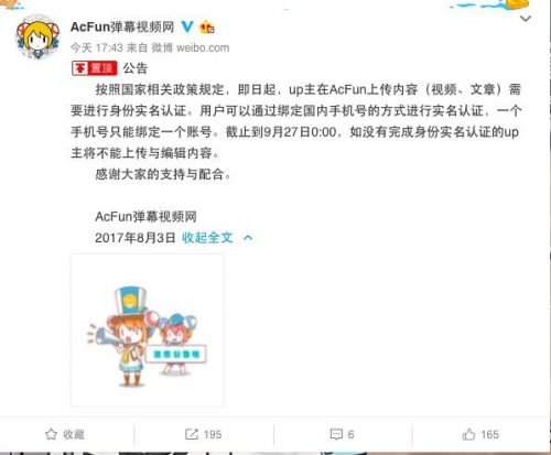 8月3日消息,AcFun弹幕视频网今日在官方微博上发布声明称,按照国家相关政策规定,即日起,up主在AcFun上传内容(视频、文章)需要进行身份实名认证。截止到9月27日0:00,如没有完成身份实名认证的up主将不能上传与编辑内容。
