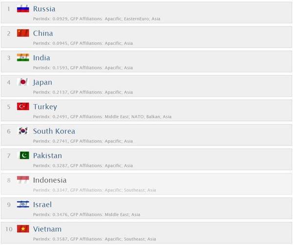 来自美国的一项使用了超过50个指标进行排名的榜单中,亚洲强国军事排名前十位依次是:俄罗斯、中国、印度、日本、土耳其、韩国、巴基斯坦、印度尼西亚、以色列、越南。