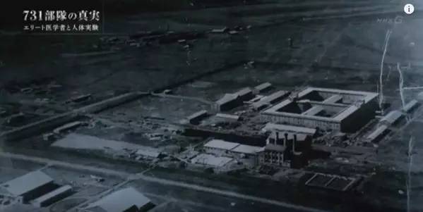 解说员:这是(“731部队”总部)当时的照片。部队在方圆数公里的广阔营地中,极其秘密地实施着研究。在四方形的三层大楼里,并排着的是装备有制冷制暖设备的最先进的研究室。大楼中央设置有从周围无法看见的牢狱,用来关押被用作试验材料的人们。