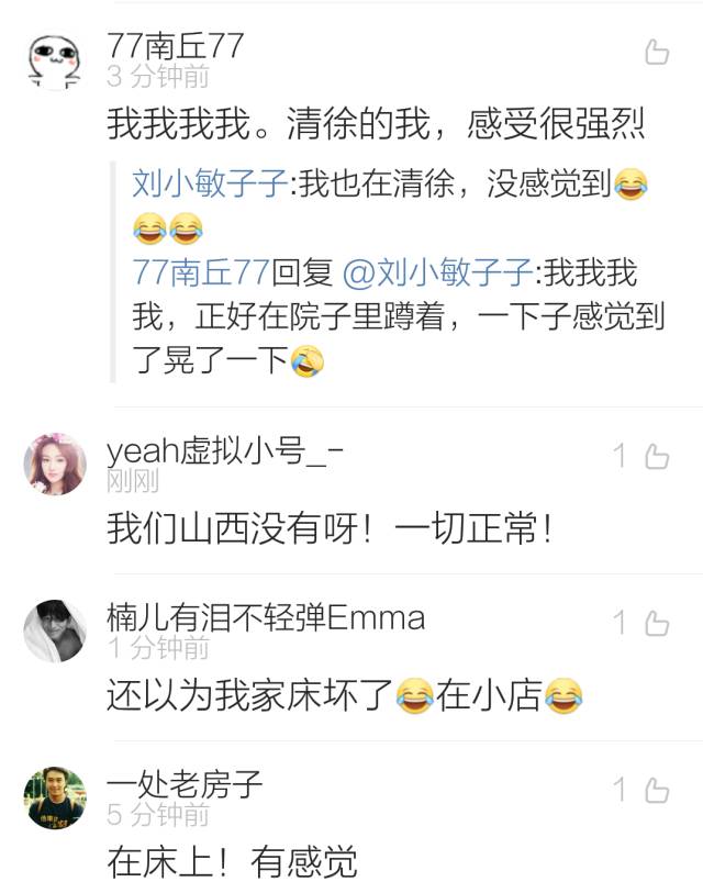 地震发生时,正在20楼办公的李女士突然感到地面发生轻微摇晃,而众多太原周边的微博网友也表示“感受强烈”。