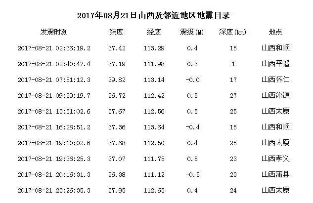 此外,山西省地震局在其官网发布了8月21日山西及邻近地震目录及分布图,具体如下: