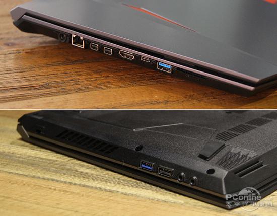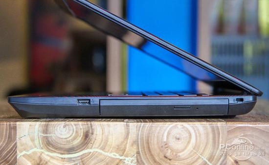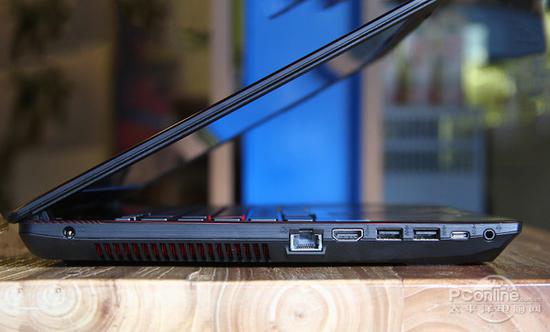 机身两侧是它的接驳区域,出于大部分用户使用习惯考虑,机身右侧拥有一个刻录光驱与一个USB2.0接口,其余接口均安置在机身左侧;左侧接口包含两个USB3.0接口,一个Type-C接口,一个RJ-45有线网络接口,一个HDMI高清接口以及耳机麦克风复合接口,再向上靠近转轴处长约7cm左右则是它的散热出风口,这样的设计不会影响用户。