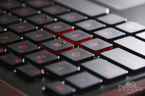 华硕ZX53VE采用的是主流的巧克力键盘设计,按键的回弹力适中,键程较佳,小键盘的设定也能让游戏玩家有着更丰富的快捷按键设定,在WSAD四个标准游戏方向按键的下方还有特殊的红色标识,这也是游戏本的专属设定。