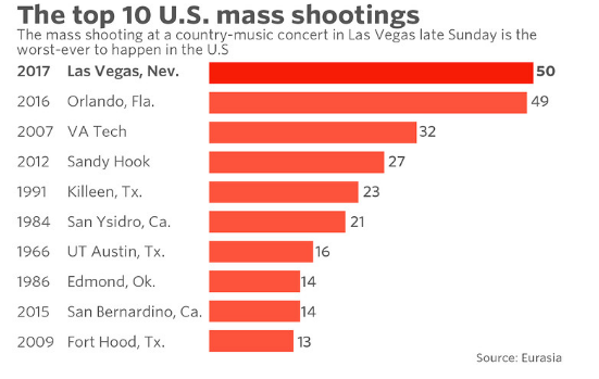 发生在上周日晚间拉斯维加斯曼德勒湾酒店赌场场外音乐节的枪击案已经成为了美国史上伤亡最惨重的枪击案,也是继911事件以来发生在美国本土伤亡最严重的一起袭击。位于美国纽约的国际关系智库Eurasia此前发布了有关美国史上最严重的十大枪击案的报告,回顾了相关历史。
