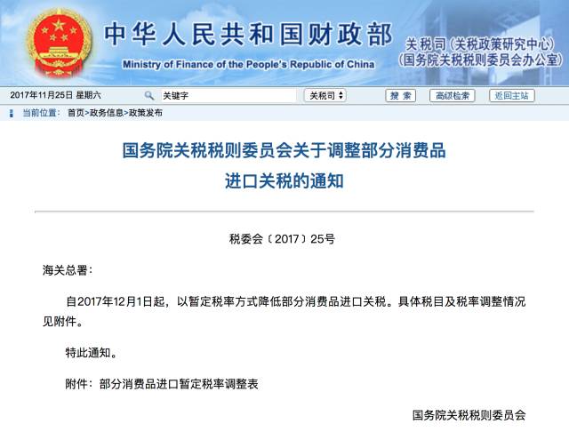 财政部近日发布消息,从12月1日起,我国将进一步降低部分消费品进口关税,平均税率由17.3%降至7.7%。