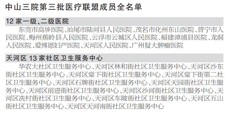 中山三院院长、骨科教授戎利民介绍,此次纳入中山三院第三批医院联盟成员单位共有25家,其中包括东莞市高埗医院等12家一级、二级医院,以及华农大社区卫生服务中心等13家社区服务中心。至此,中山三院医院联盟单位已达到59家。