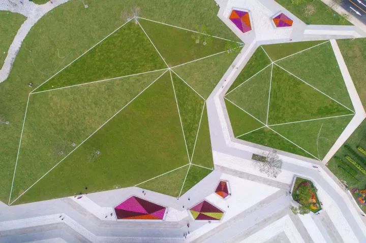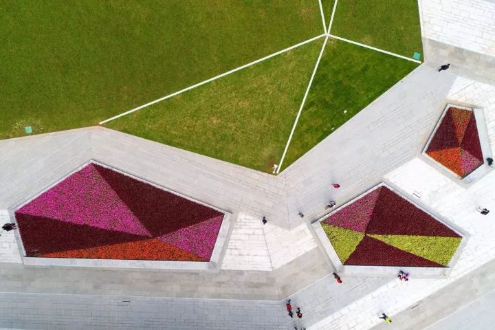 ○ 此外,草坪还用玻璃进行了“切割”,玻璃下就是彩灯。“白天俯瞰,三色草坪组合起来就是一颗钻石。”唐炯说,夜晚,彩灯将大草坪“切割”成一颗有机的大钻石。