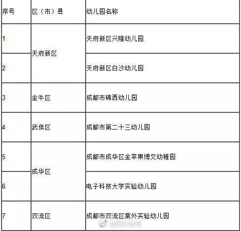 据成都市教育局消息,拟确定天府新区兴隆幼儿园等7所幼儿园为成都市一级幼儿园,公示名单如下↓↓如对上述幼儿园有情况需要反映的,请于7个工作日内向市教育局学前教育处书面(邮箱:sxqjyc@163.com)、电话(61881672)反映或面谈。