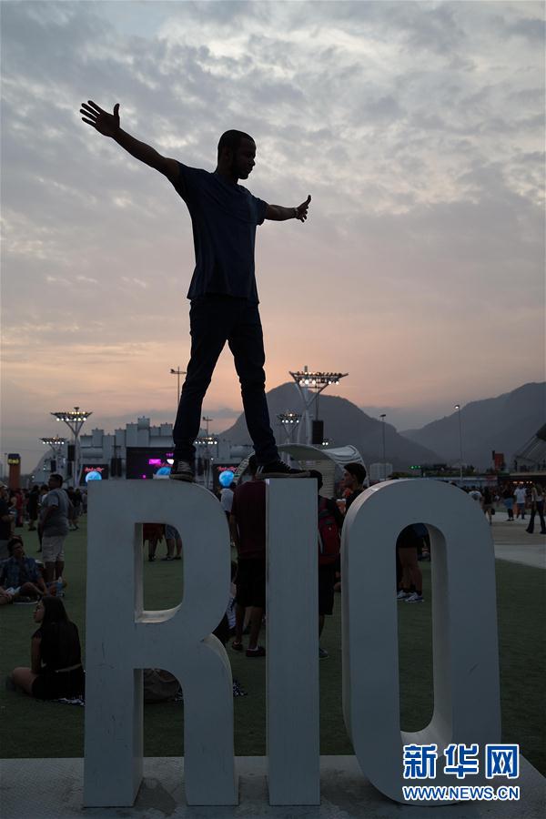 9月24日,在巴西里约热内卢,一名乐迷站在里约字样的字母雕塑上留影。新华社记者李明摄