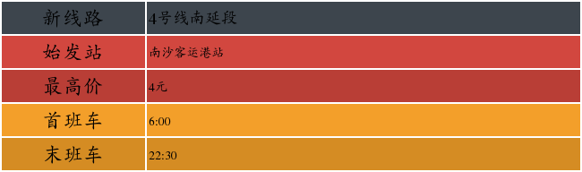 4号线南延段四号线南延段全长12.6公里,共设6座车站,线路大致呈南北走向,从现在四号线的金洲站开始,向南延伸至南沙客运港站。4号线全线单程最高票价:11元。