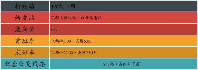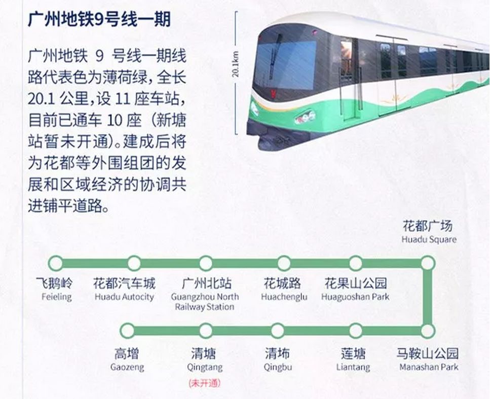 九号线一期全长20.1公里,共设11座车站(清塘站计划明年开通),线路西起花都区飞鹅岭站,东至白云区高增站,其中,广州北站与远期八号线北延段换乘、高增站与三号线换乘;单程最高票价:6元。